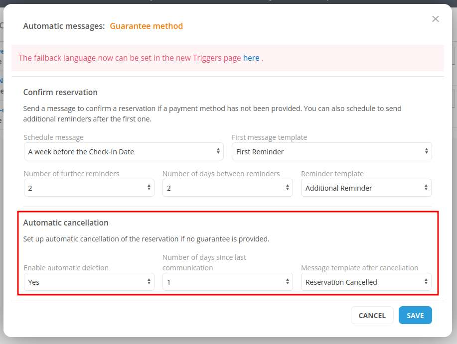 - the automatic cancellation of the reservation if the guest does not guarantee it after X days: