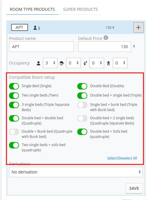 We have implemented the possibility of assigning predefined room setups (Double, Twin, Double with an extra bed, etc.) to each Product: