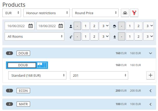 Η ενότητα Διαθέσιμα Προϊόντα σάς επιτρέπει να ορίσετε τις ημερομηνίες διαμονής και να επιλέξετε δωμάτιο(α). Όταν αναφέρετε την περίοδο διαμονής, το Zak ελέγχει ποια προϊόντα είναι διαθέσιμα σε αυτήν την περίοδο. Εάν έχετε δημιουργήσει πολλά υποπροϊόντα για τα δωμάτιά σας με βάση τη χωρητικότητα, μπορείτε επίσης να καθορίσετε τη χωρητικότητα (αριθμός ενηλίκων, εφήβων, παιδιών και μωρών) για να βελτιώσετε περαιτέρω την αναζήτησή σας. Έχετε γρήγορα πλήκτρα για πληρότητα 1/2 και για αριθμούς 3 και πάνω μπορείτε να ανοίξετε το αναπτυσσόμενο μενού.