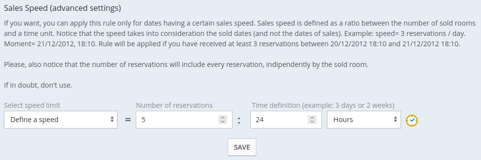 • Ορισμός Ταχύτητας: εδώ μπορείτε να ορίσετε έναν κανόνα που να λειτουργεί σύμφωνα με την ταχύτητα πωλήσεών σας. Η ταχύτητα πωλήσεων είναι ο αριθμός των κρατήσεων που λαμβάνονται σε ένα συγκεκριμένο χρονικό εύρος. Επομένως, μπορείτε να ορίσετε τον κανόνα να ενεργεί μόνο εάν λάβετε X κρατήσεις σε χρόνο X. Μπορείτε να επιλέξετε τον αριθμό των κρατήσεων και την ώρα (σε ημέρες, εβδομάδες ή μήνες).