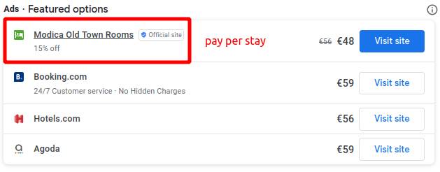 Pay Per Stay: για κάθε κράτηση υπάρχει προμήθεια 10% στο ΣΥΝΟΛΟ. Θα τη βρείτε μαζί με τις πληρωμές σας στον λογαριασμό σας στο WuBook. Με αυτό το μοντέλο, θα έχετε μεγαλύτερη ορατότητα στο Google επειδή η ιστοσελίδα σας θα εμφανίζεται στο προσκήνιο:
