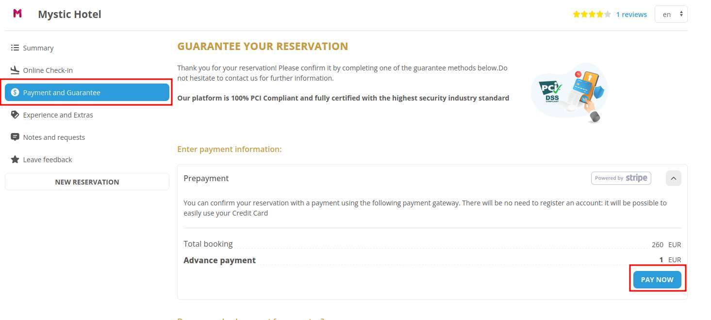 Ο πελάτης σας θα λάβει ένα email με τις λεπτομέρειες της προσφοράς και έναν σύνδεσμο προς τη Σελίδα Online Check-in. Ακριβώς, στην ενότητα "Εγγύηση της κράτησής σας", όπου θα μπορεί να επιβεβαιώσει την κράτησή του μέσω μιας από τις μεθόδους εγγύησης που ρυθμίσατε: