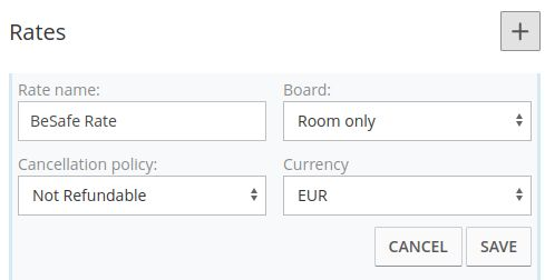 2. Once created the cancellation policy, you are ready to create the rate for Be Safe, in the section below. Click on the +, choose the name, the board and the policy you have just created.