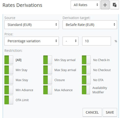 3. Once created the rate, you can choose to set an automatic price derivation by clicking on the + next to "Rates Derivations". For example, a -10% from the "Standard" rate: