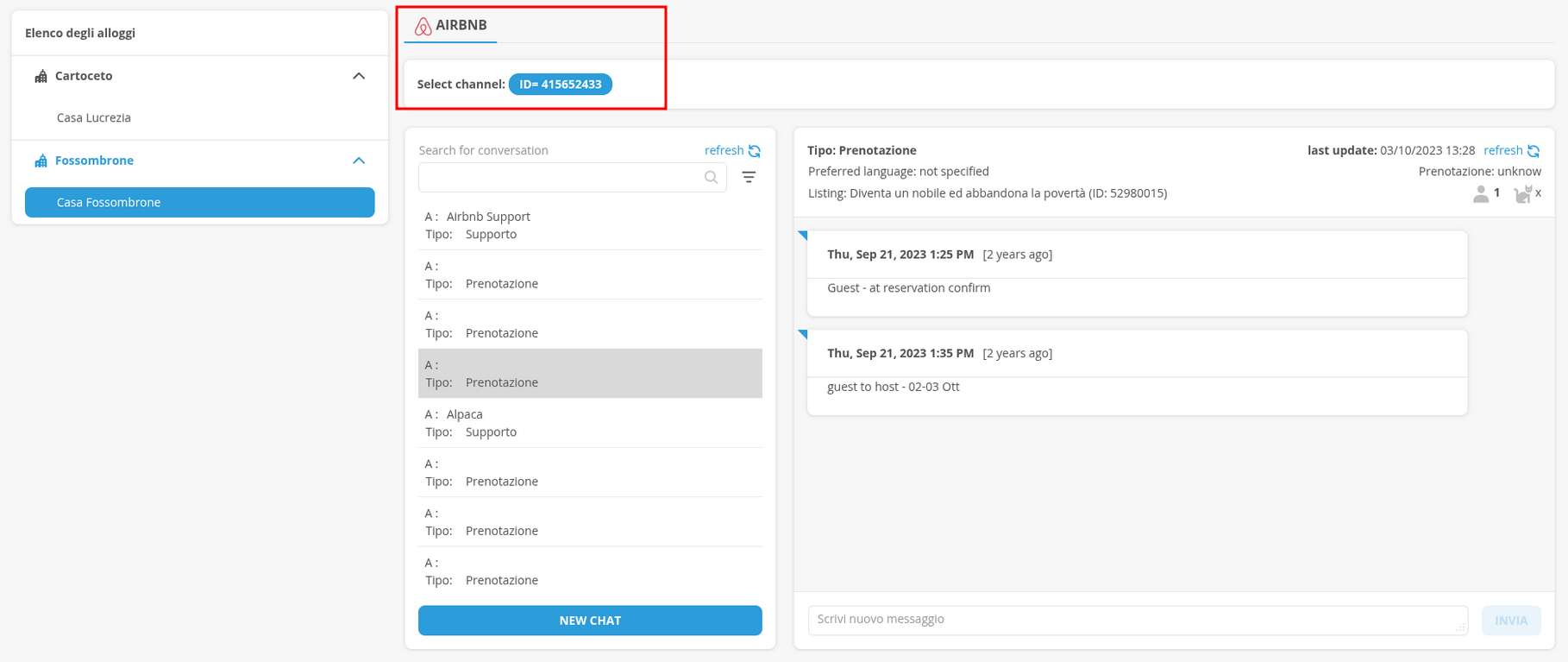 Once you have selected an accommodation and the channel you are interested in, a list of conversations with customers for that channel will appear in the central section of the page.