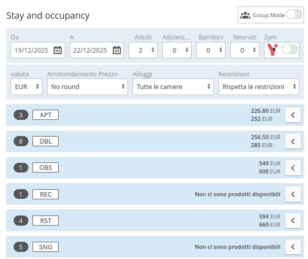In addition to honoring or skipping the restrictions, you can also choose the Group Reservation option: you can quickly select more room categories and more physical rooms by clicking "+". If you have made a mistake, you can always remove them by clicking on the "-" . In the example below, I have chosen 3 Double rooms and 1 Single room.