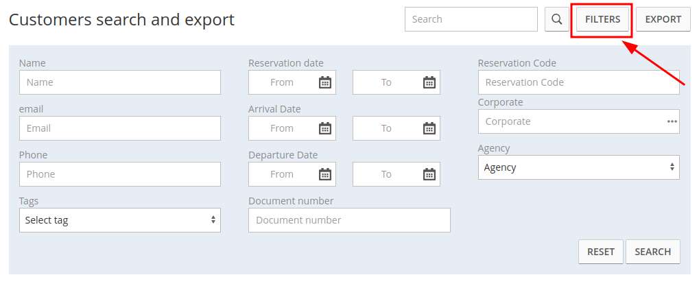 - the FILTERS button, to filter your search by setting parameters such as dates, agency/corporate, reservation code, customer tag, etc: