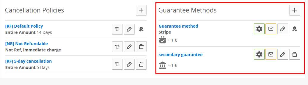 A guarantee method defines the use of Credit Card data provided by guests to guarantee your reservations. Zak provides you with 5 basic reservation guarantee methods, which you can use to set up your Guarantee Rules, even enabling more than one at the same time in the same Rule: