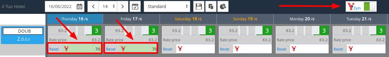 Select the rate on the top and enable the Zym button to display the prices generated by Zym. To overwrite a price manually, type it in the white field marked with the Zym icon. To cancel your change, just click on "Reset". Example: