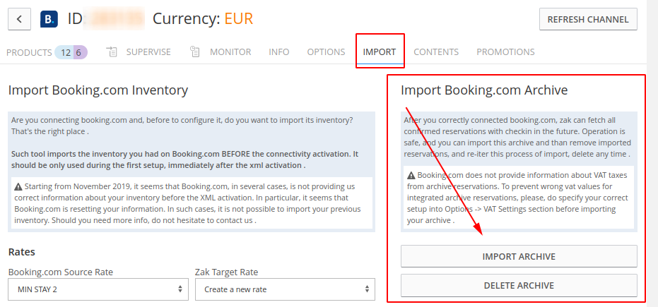 To download the Booking.com reservation archive, go back to the IMPORT section and click on IMPORT ARCHIVE: