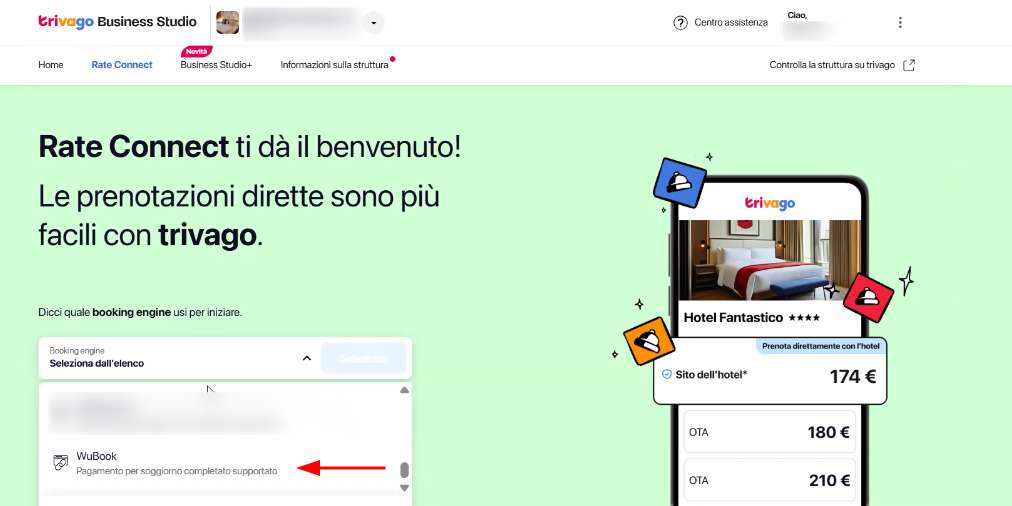 At this point, you will have completed the configuration in ZaK and can access Trivago Business Studio, in the Rate Connect section, to select WuBook as your Booking Engine and request activation of the campaign. If this step is not yet available, you will need to wait approximately 7 days for WuBook to send your property to Trivago and then try again to activate the Rate Connect campaign, as shown in the screenshot below: