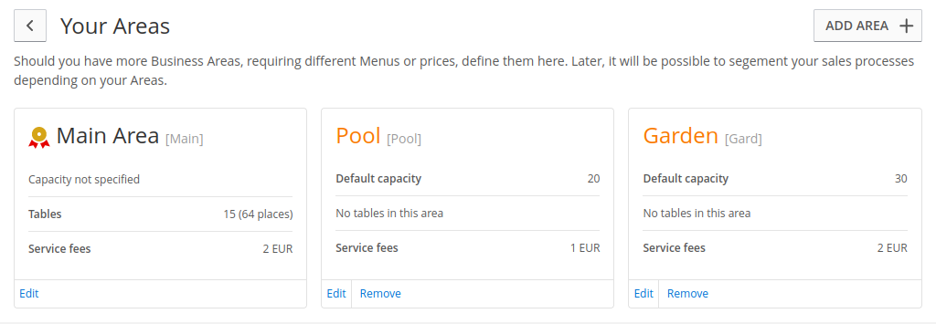 If your restaurant is composed several areas, this is the right section to configure them! You can create as many areas as you need, without limits. To each area you can assign its own menu and prices. For example, in addition to a restaurant I could also have a bar area and a pool area, where my menu includes drinks and appetizers rather than a full dinner/lunch.