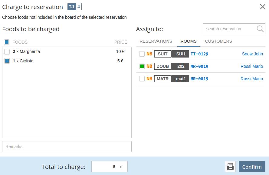 Choose now if charging the service to a reservation, a room or a specific customer: