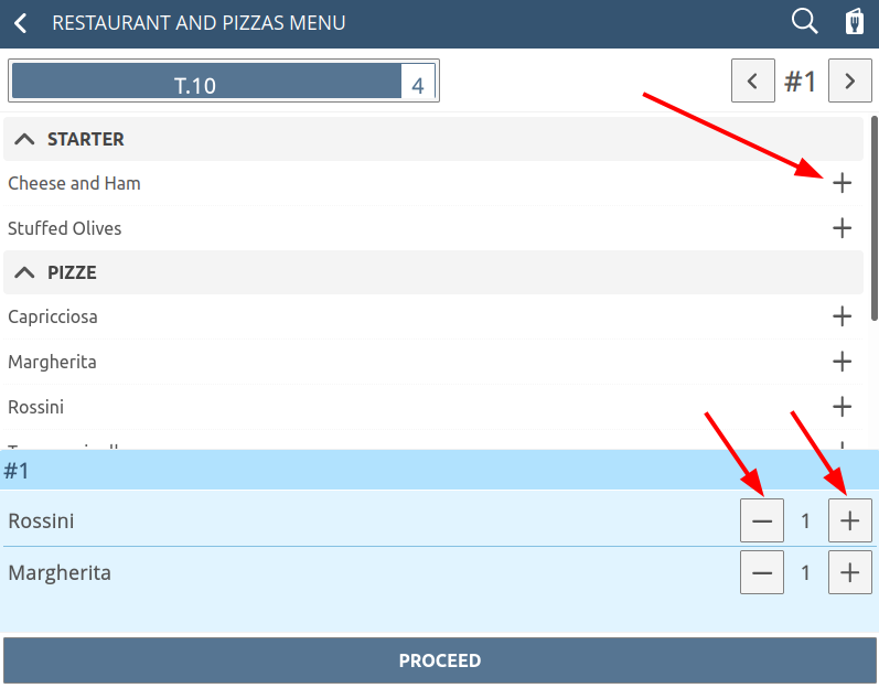 When ordering, you can add the various dishes in pages #1, #2, #3, etc. to define in which order the food should be prepared and served. For example, I add pizzas in page #1 and save. Then I move to page #2, add the dessert and save. And so on.