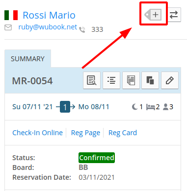 Tags for clients can also be created from the reservation detail, by clicking on the icon next to the name of the booker: