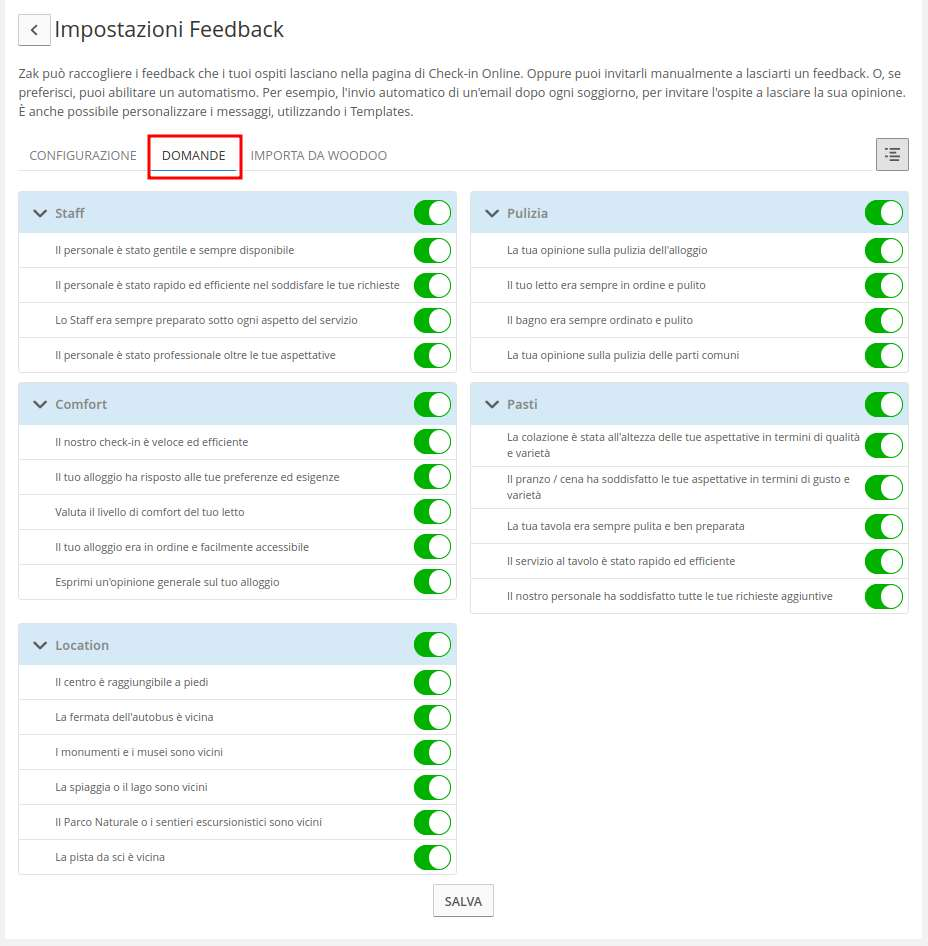 Finally, on the Feedback configuration page, you will find the QUESTIONS subsection, where you can specifically choose all the parameters by which guests will evaluate you. These cannot be modified, but you can activate/deactivate them as you wish: