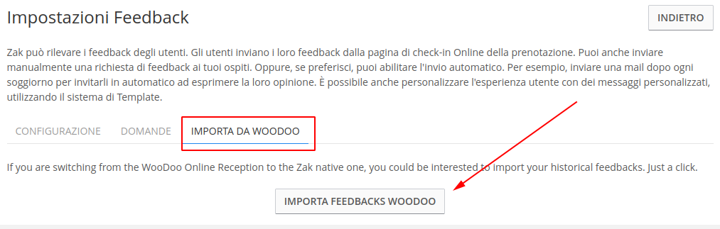 If you were using WooDoo's Booking Engine and have now switched to ZaK, don't worry: your existing feedback won't be lost! You can import it into ZaK via the IMPORT FROM WOODOO section. Here, you simply click the button and wait a few minutes. Your feedback will be imported automatically, no further action is required.
