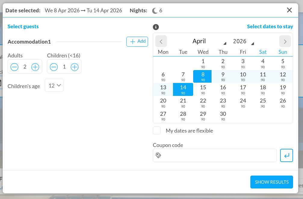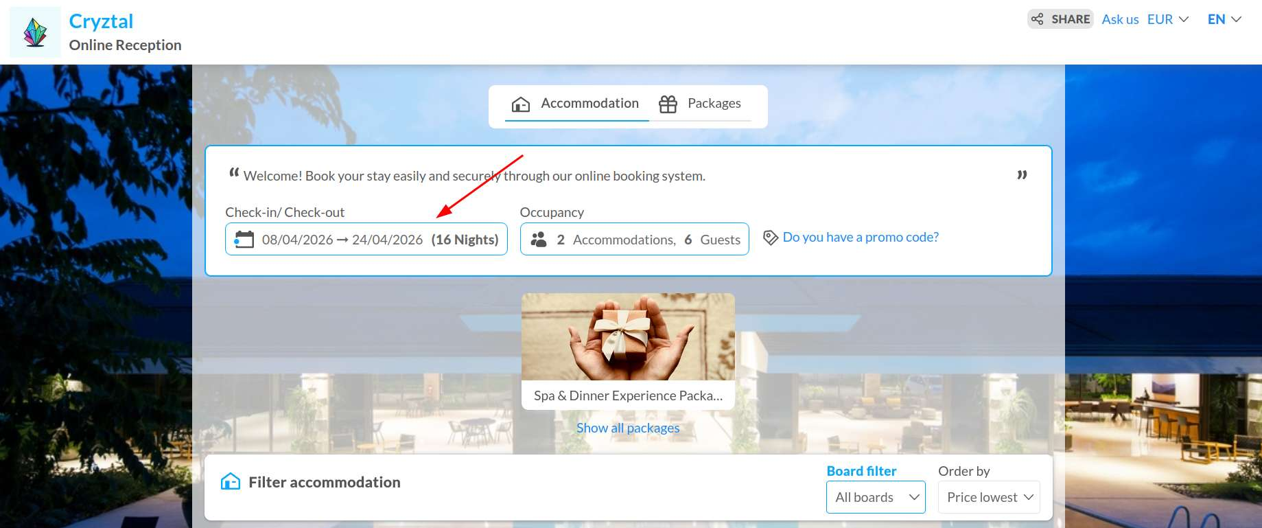 First, the guest will see all the packages available (if you've created any), and then they can choose to book a package. Alternatively, they can enter the dates and occupancy to search for all available accommodations.