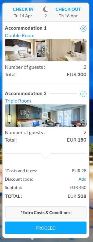 At this point, the guest will have added the room(s) to the cart and can continue. As soon as at least one room is selected, the cart appears on the right, providing a summary of the selected accommodations: