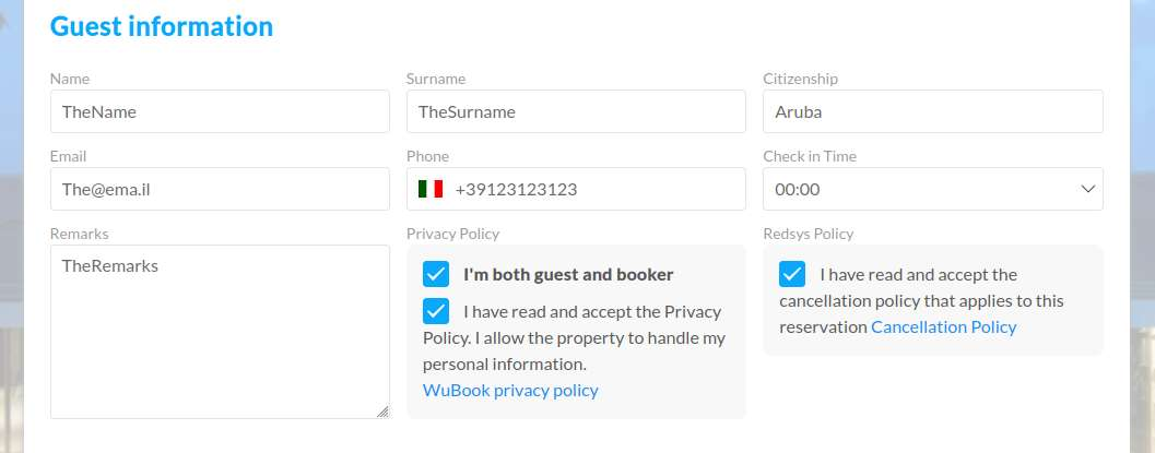 Scrolling down, the customer will need to fill in all their personal information, select their check-in time, and accept the privacy policy: