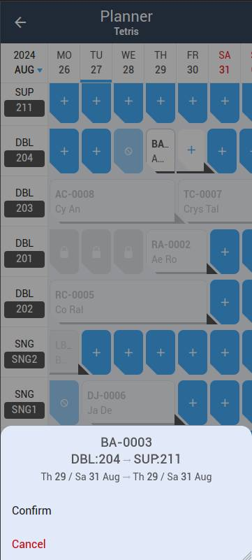 By clicking on a reservation and selecting “Move (Tetris)”, the planner will enter Tetris mode, and all boxes into which the selected reservation can be moved to will be highlighted in bright blue color.