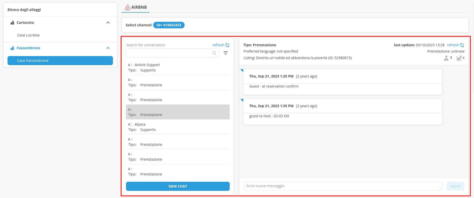 Once you have selected an accommodation and the channel you are interested in, a list of conversations with customers for that channel will appear in the central section of the page.