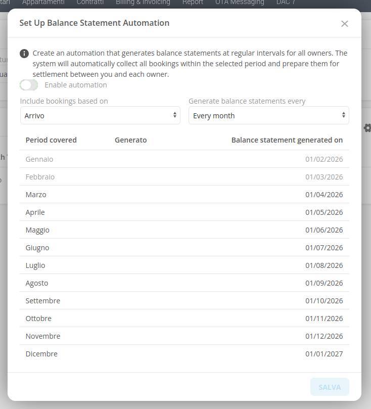 If automation is enabled, you can set the frequency of generation, allowing you to generate statements every 1, 2, 3, 4, 6, or 12 months.
