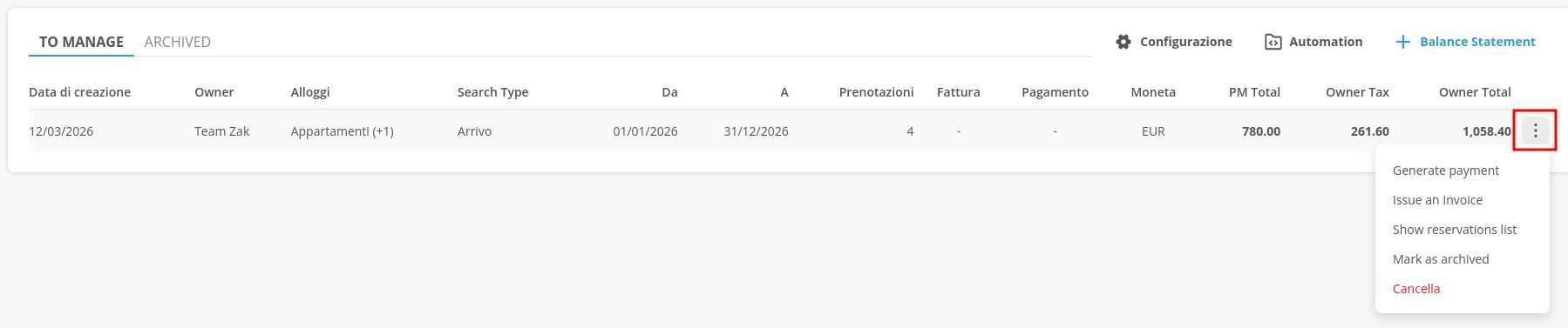 From the account statement, using the button on the right, you can proceed to generate the payment to the owner(s).During this phase, you are prompted to select the payment type,