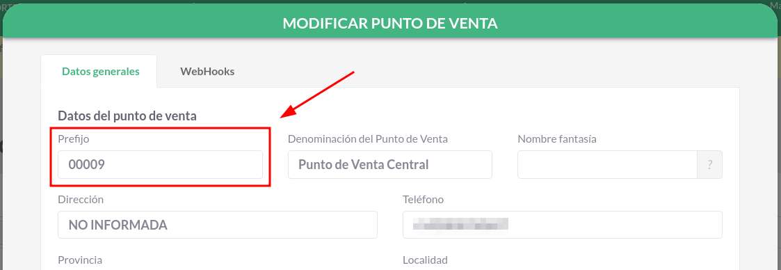3- Para finalizar, ingresa a la web de Facturante: https://www.facturante.com/Usuarios/LogOn (con el usuario y contraseña creados previamente en ZaK) y ve a Mi organización → ️ Puntos de venta y modifica el prefijo del Punto de Venta Central (haciendo clic en el lápiz verde). Este prefijo debe coincidir exactamente con el número del punto de venta creado en el paso anterior en la página de AFIP: