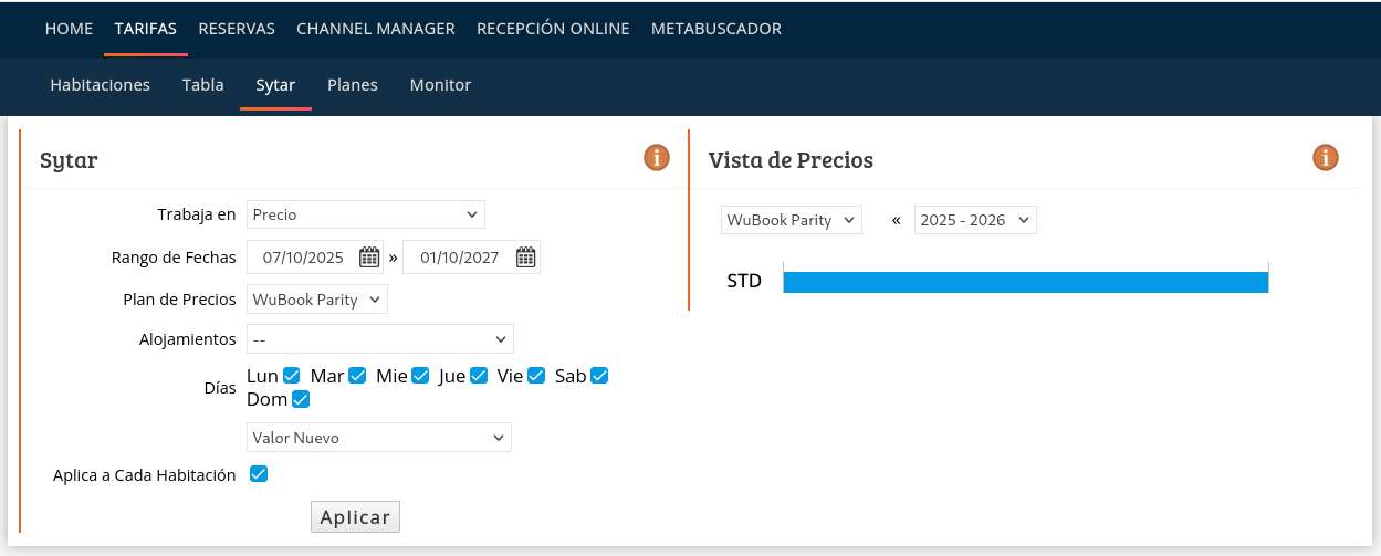 Si deseas cambiar los datos de tus habitaciones (disponibilidad, precios, restricciones, no OTA) durante varios días y varias habitaciones, te recomendamos el uso de Sytar. Esta herramienta te permite cambiar cada dato diario en un rango de fechas prolongado, con un solo clic.