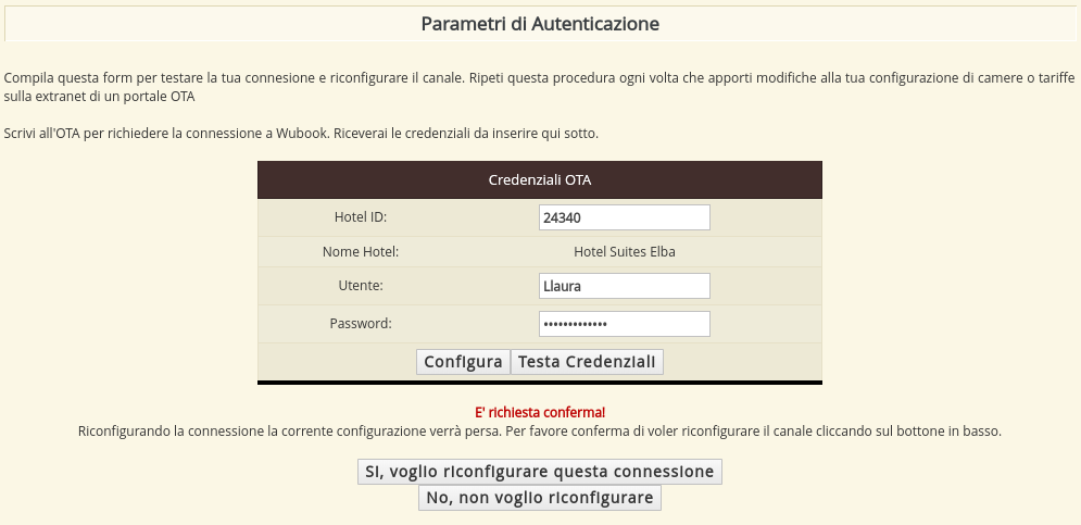 A screen will open: enter the required credentials provided by OTA for the connection with the Channel Manager.