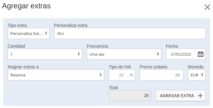 Si ya has creado la reserva, podrás agregar uno o más extras desde los detalles de la misma en cualquier momento. De nuevo, podrás elegir entre los extras existentes o crear uno nuevo. Simplemente haz clic en la sección "EXTRAS" y luego en el +:
