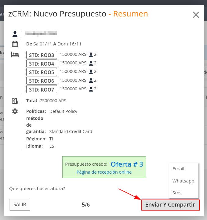 Al pulsar el botón en cualquiera de los apartados antes mencionados deberás elegir primero qué canal de mensajería deseas comunicarte (Email, SMS o WhatsApp).