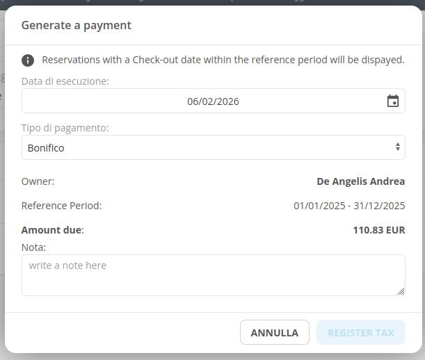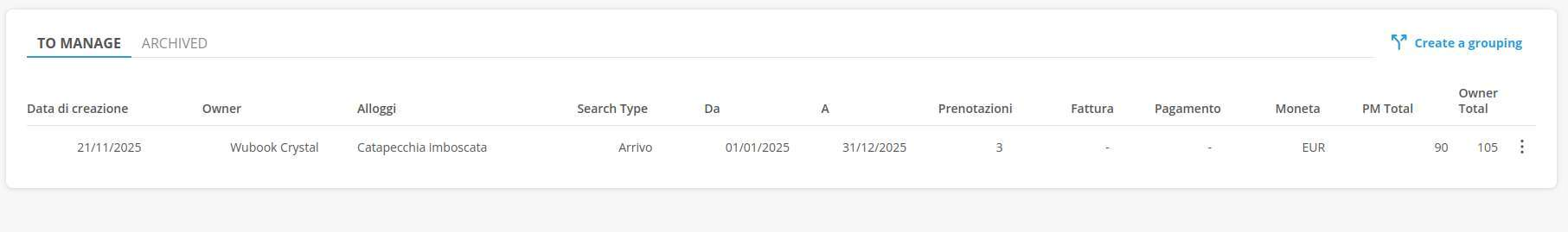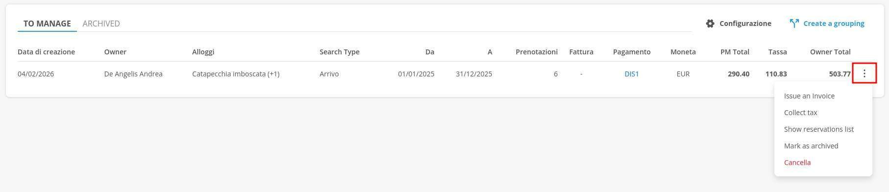 From the grouping, using the appropriate button on the right, you can proceed to generate the payment to the owner(s).