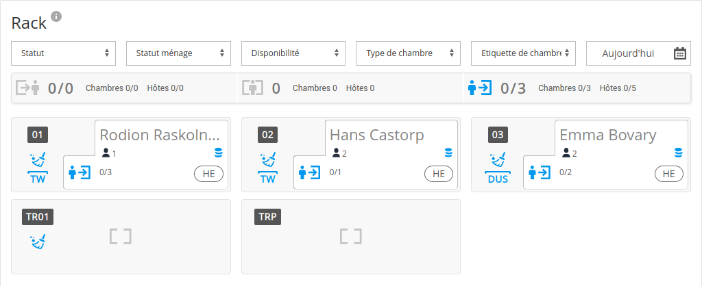 Grâce à cet outil, vous pouvez vérifier l'état et la " réservabilité " de vos chambres physiques, tous les jours. Par exemple, si vous êtes au téléphone avec un client qui souhaite réserver une chambre, vous pouvez utiliser l'outil Rack pour choisir, parmi les chambres disponibles, celle qui convient le mieux.