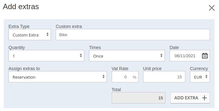 Si vous avez déjà créé la réservation, vous pouvez toujours accéder aux détails et ajouter un ou plusieurs extras à tout moment. Encore une fois, vous pouvez choisir parmi les extras déjà créés dans le ZaK ou en créer un nouveau :