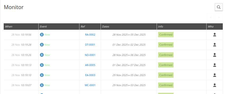 Cliccando in ogni colonna dell'evento ottieni il dettaglio completo; data ora, indirizzo IP le camere coinvolte etc etc. Cliccando invece sul codice della prenotazione, accedi alla pagina del "Dettaglio della prenotazione", qui di seguito il link all'articolo di approfondimento.