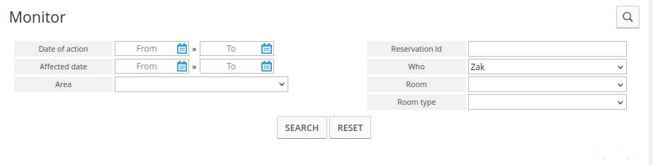 Attraverso l'icona a forma di lente, in alto a destra,  puoi accedere alla funzione Filtro degli eventi. I campi disponibili sono la Data di azione, le date influenzate, l'Area l'Id Prenotazione, Chi Camera e Tipologia di camera.