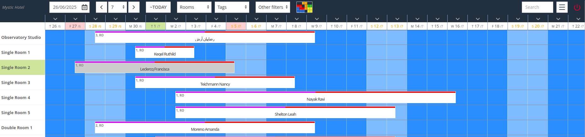 Questo strumento permette una visione geometrica delle prenotazioni: si tratta di una tabella con le camere fisiche nelle righe e i giorni del calendario nelle colonne. I soggiorni-camera delle prenotazioni sono rappresentati da segmenti con il nome del cliente prenotante.