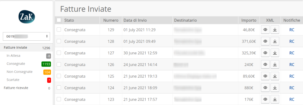 - invio delle fatture all'SDI direttamente da ZaK, usufruendo anche della conservazione sostitutiva. In tal caso ZaK si avvarrà di un provider partner certificato dall'Agenzia delle Entrate.