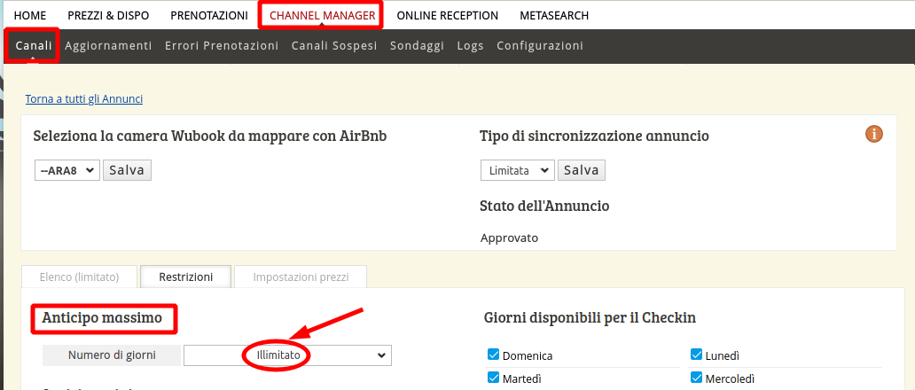 2. Senza disconnettere l'annuncio, puoi provare a disabilitare la restrizione "Anticipo massimo" direttamente dalla pagina di Impostazioni dell'annuncio interna al canale Airbnb su WooDoo.