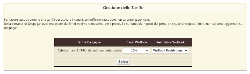 5. Una volta salvato, scendi fino alla sezione GESTIONE DELLE TARIFFE. Qui puoi associare il piano tariffario e il piano restrizioni WuBook con cui vendere su Despegar.