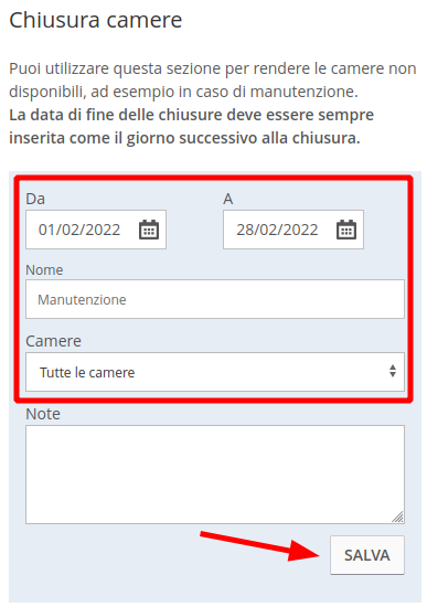 Nella finestra che si aprirà, vai alla sotto-sezione CHIUDI LA CAMERA e scegli quante notti chiudere. Puoi anche definire un'etichetta per quella chiusura o aggiungere altre camere da chiudere: