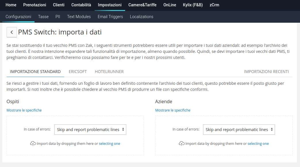 L'unica cosa che devi fare è scegliere come il sistema debba gestire gli eventuali errori d'importazione (fermarsi al primo errore oppure saltarli automaticamente e mostrane il numero alla fine) e caricare sul tuo computer (o trascinare sulla schermata) il file cvs/xls che contiene i dati del tuo vecchio PMS.
