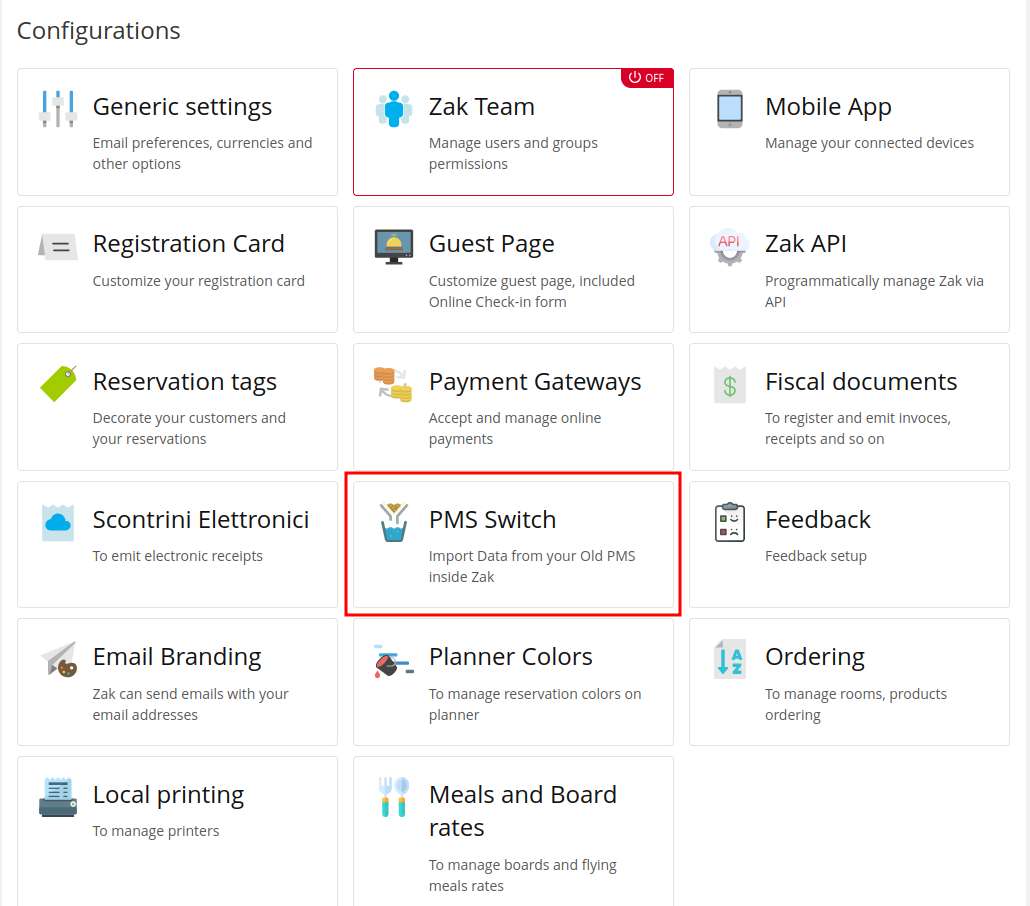 ↳ Link utile: ZaK > Impostazioni > Configurazioni > PMS Switch