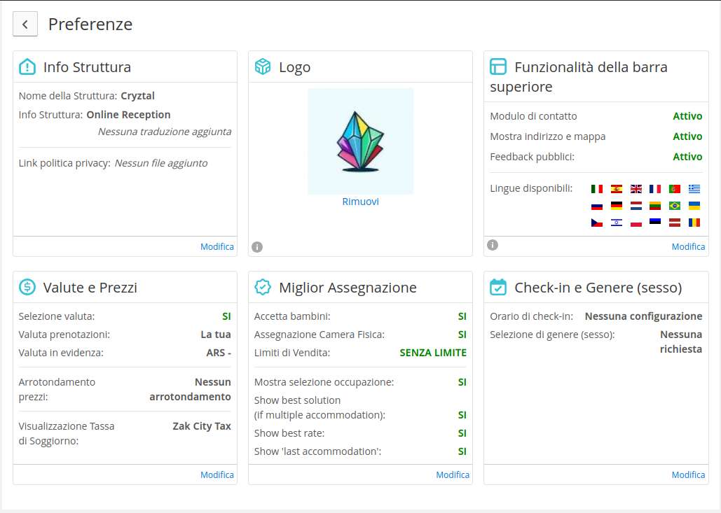 - in quali lingue vuoi consentire il processo di prenotazione. Chiaramente eventuali descrizioni inserite (per le camere, i pacchetti, gli extra, le policy, etc) andranno tradotte da te nelle lingue scelte.