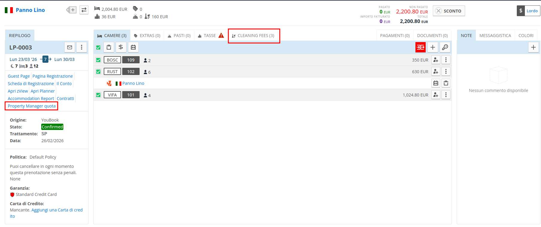 Nel dettaglio delle prenotazioni che includono appartamenti abilitati al Vacation Rental, sono stati aggiunti nuovi campi come i costi di pulizia (compilati automaticamente, ma comunque modificabili manualmente), le commissioni dei proprietari degli alloggi (anch'esse modificabili a mano) i report sulle commissioni a livello di alloggio e i contratti collegati automaticamente o aggiunti manualmente.