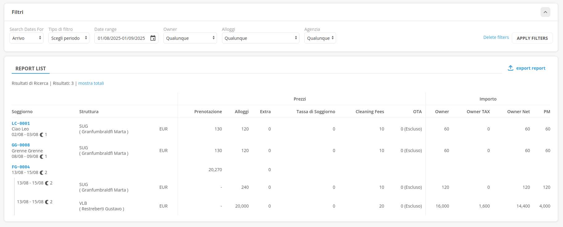 La vista del report presenta un elenco delle prenotazioni che corrispondono ai filtri selezionati, al loro interno: