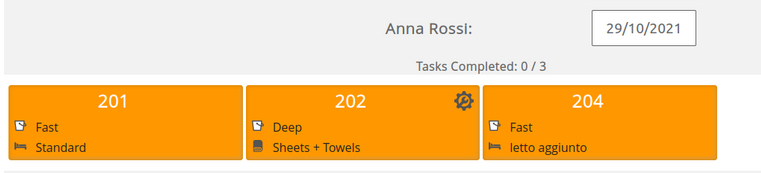 A partir de seu link, os trabalhadores podem visualizar todas as limpezas que ainda têm que fazer, elas serão mostradas em laranja. Por exemplo, Anna Rossi tem três quartos para limpar em 29 de outubro (201, 202 e 204):