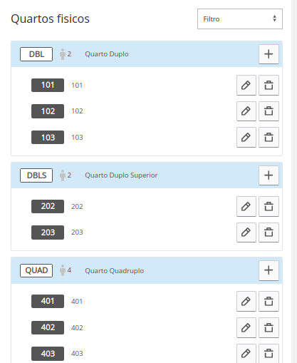 Quando as categorias de quarto estiverem prontas, é possível inserir seus quartos físicos.